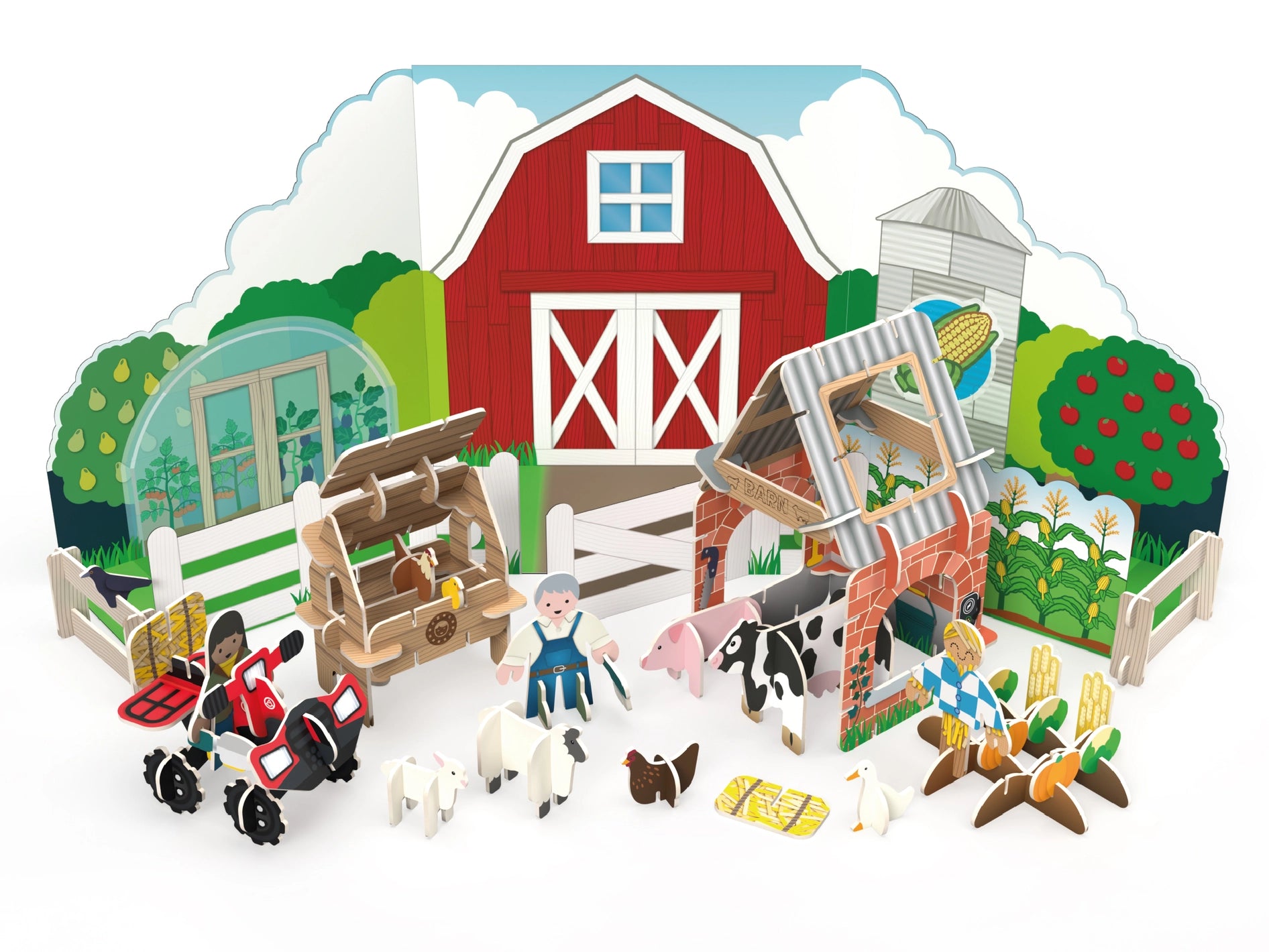 Gydag anifeiliaid i ofalu amdanynt a chnydau i’w tyfu ac i dueddu iddynt, mae bob amser yn ddiwrnod prysur lawr ar fferm PlayPress. Mae bwgan brain i helpu i gadw'ch cnydau'n ddiogel, cwt i'r ieir a hyd yn oed beic cwad i'r ffermwyr fynd o gwmpas arno. Mae Set Chwarae Buarth Fferm PlayPress yn ffordd wych o ysbrydoli oriau o chwarae dychmygus.