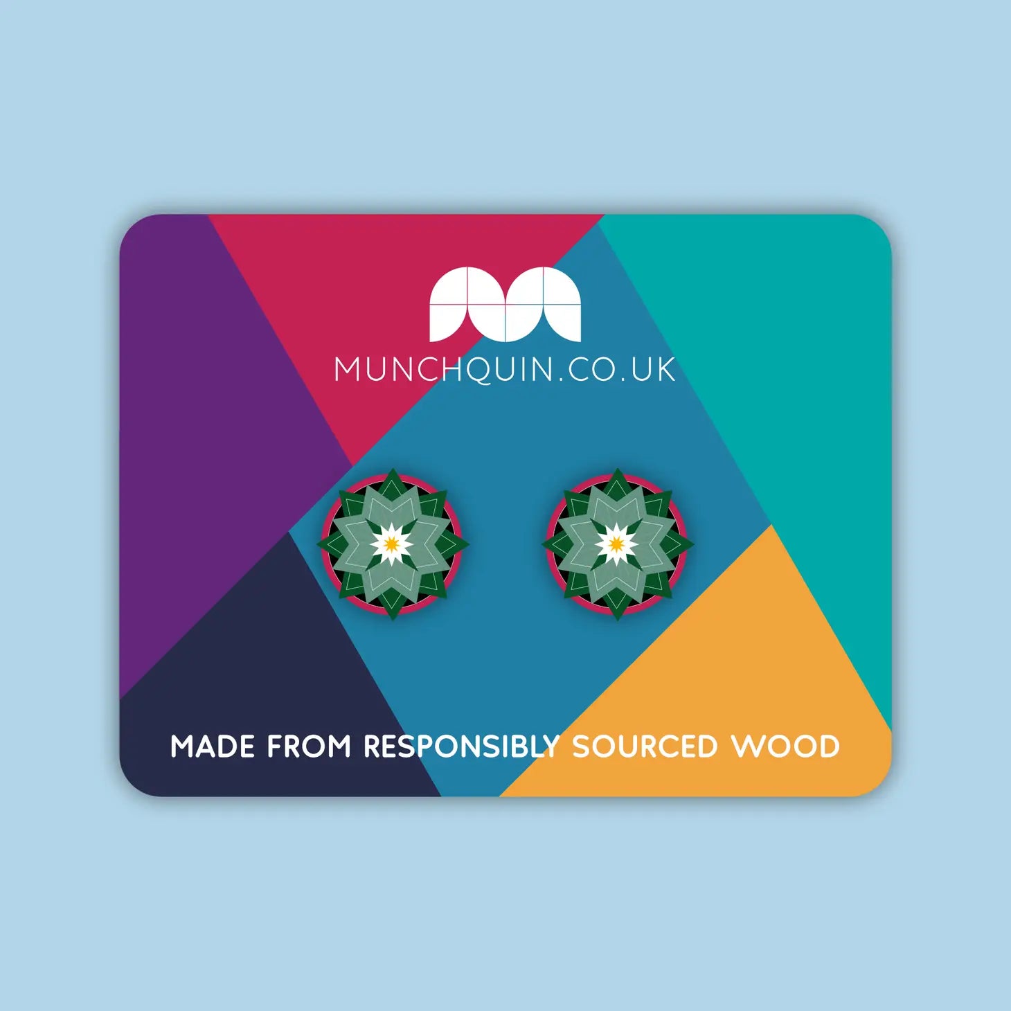 - Cofiwch, gan fod y clustdlysau hyn wedi'u gwneud o bren, efallai y bydd grawn naturiol y deunydd yn dangos trwy'r print. Mae hyn yn gwneud pob pâr o glustdlysau yn hollol unigryw.