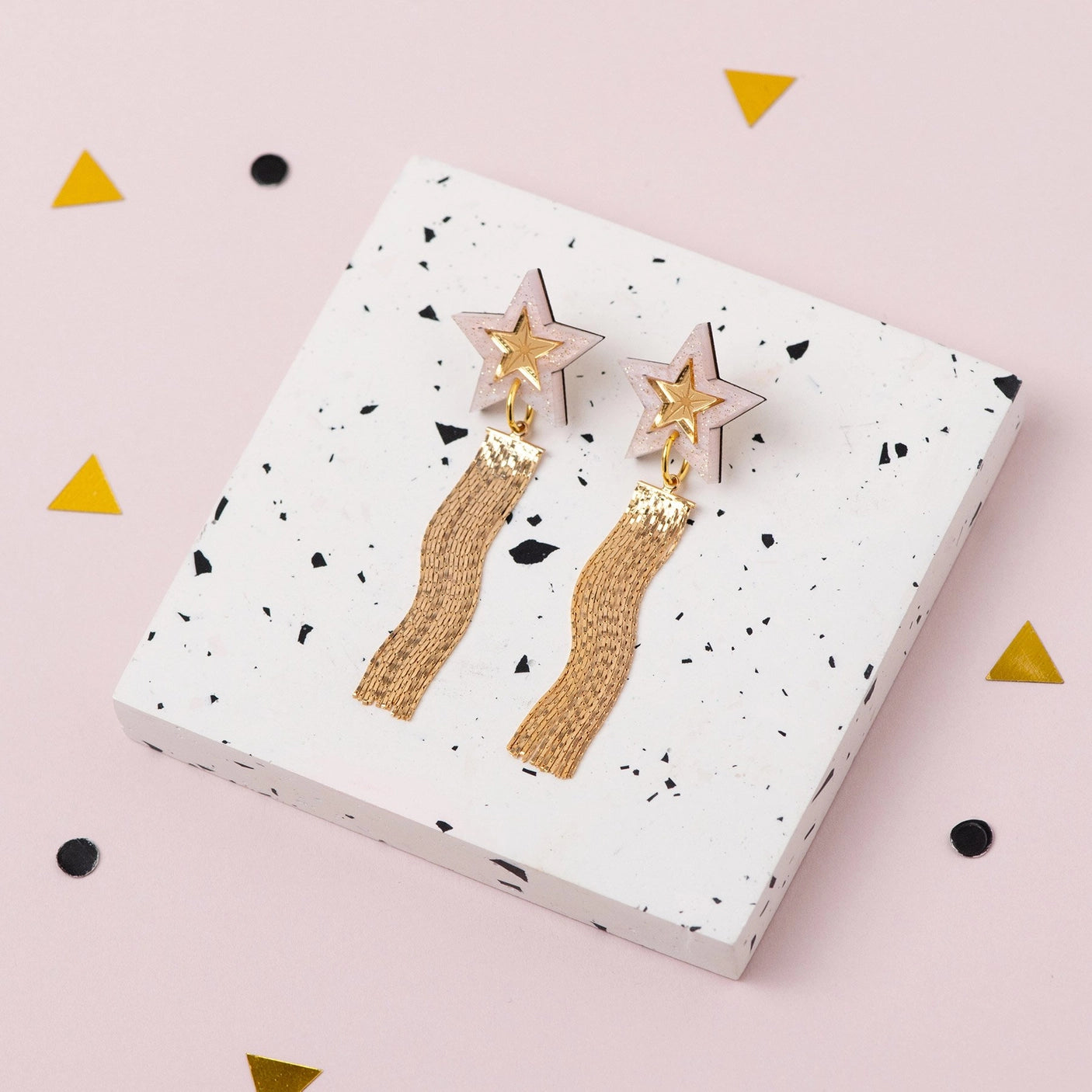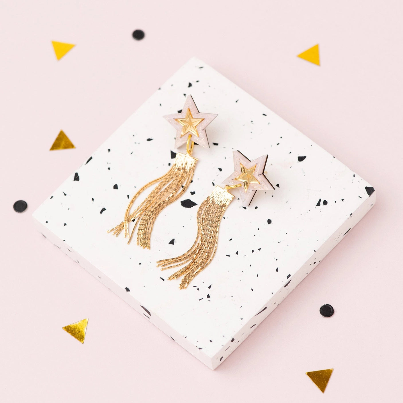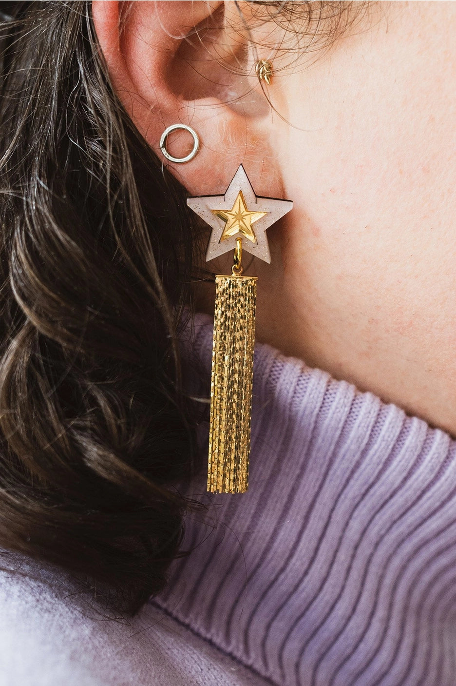 Mae'r clustdlysau hon gyda chamau lleuad chwaethus wedi'u torri â laser wedi'u gwneud o gyfuniad o acryligau moethus hardd , gan greu silwét lleuad ac awyr hyfryd .