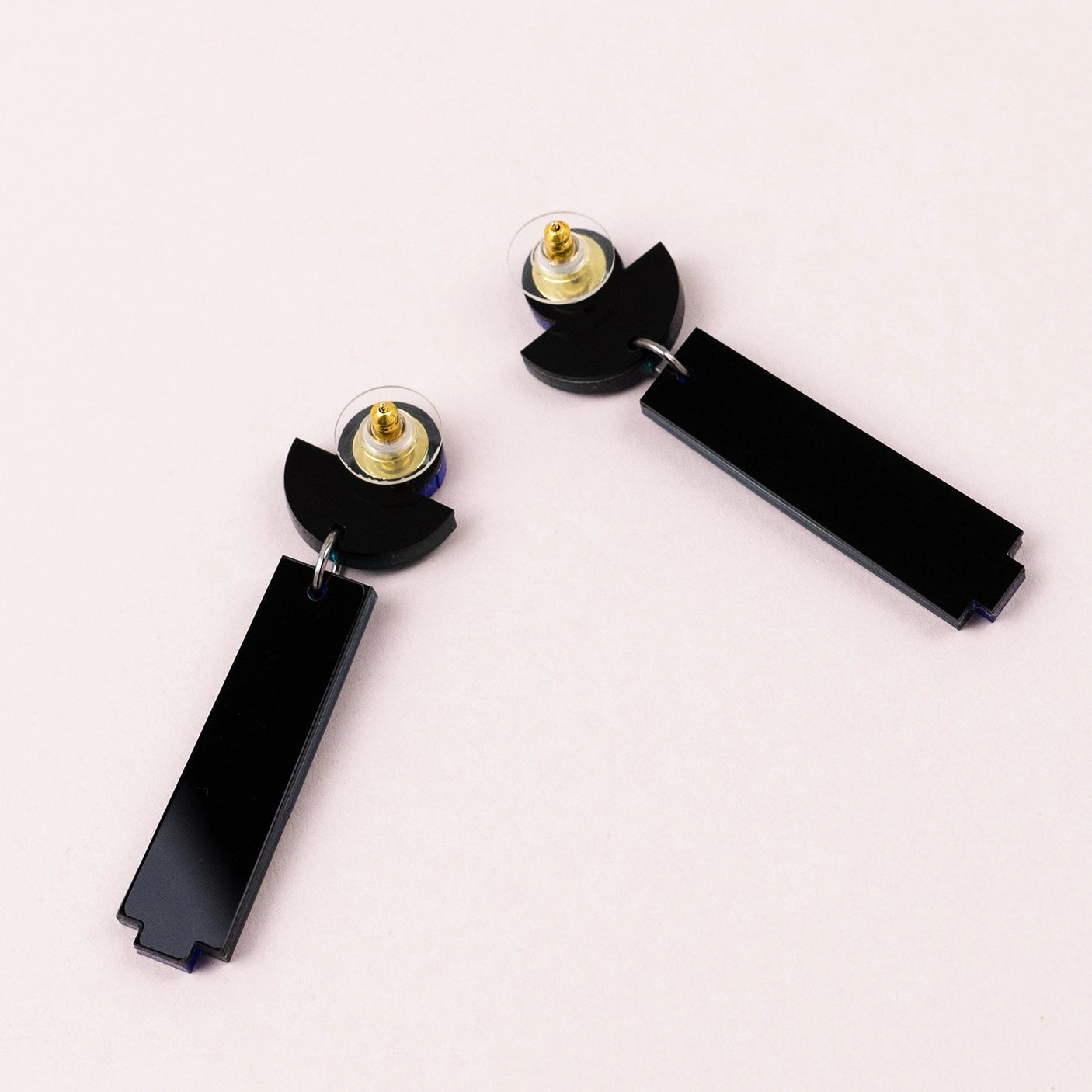 These statement dangle earrings are handmade from 70% recycled acrylic in the shape of a semi circle with a fan shape underneath. Perfect for the party season or to pep up a date, they make a thoughtful gift for Christmas, birthday, anniversary, valentines or Mothers Day present