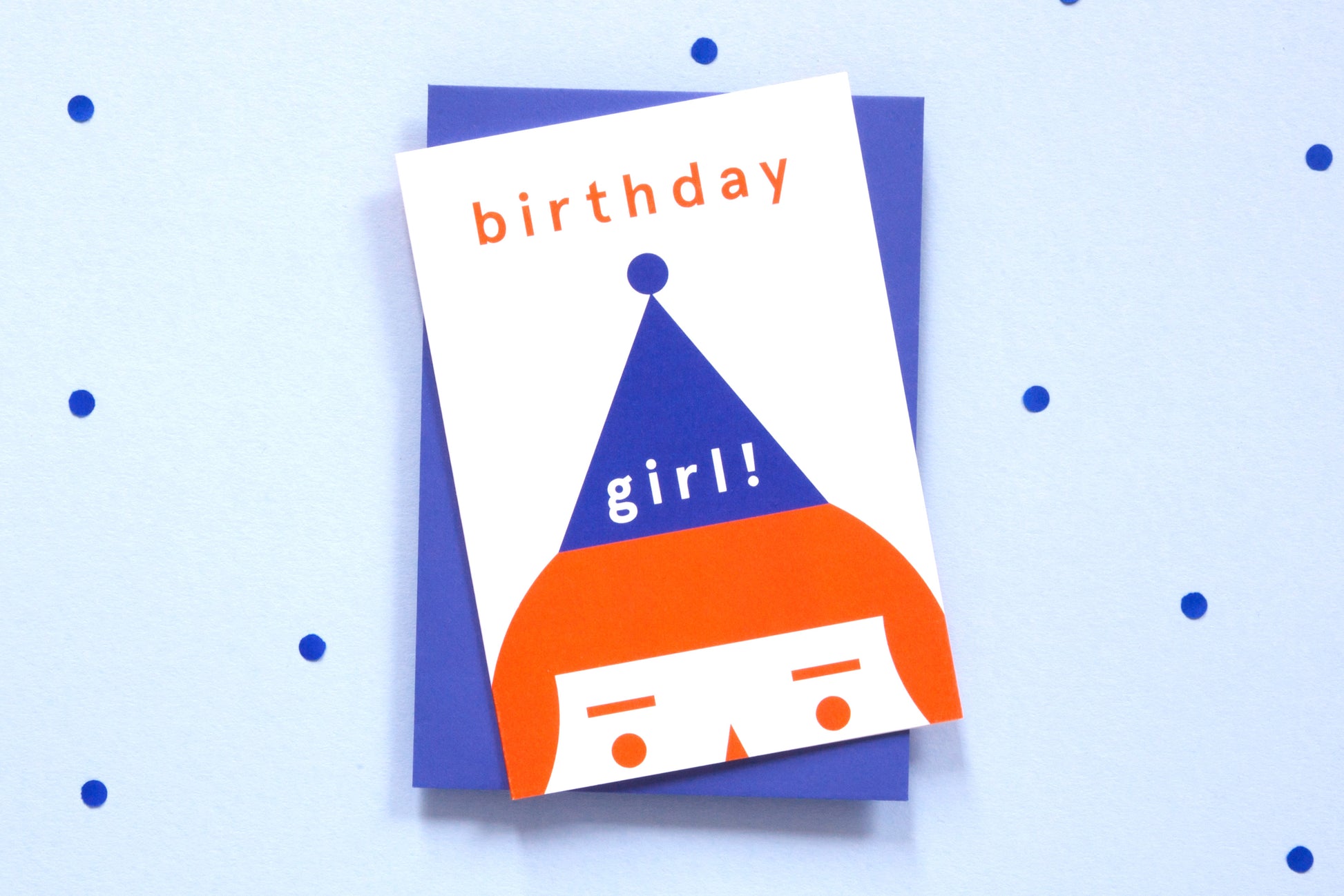 Colourful 'Birthday Girl' card from Ola's ola jr card collection, features a fun, graphic illustration. Printed onto premium British made paper.
