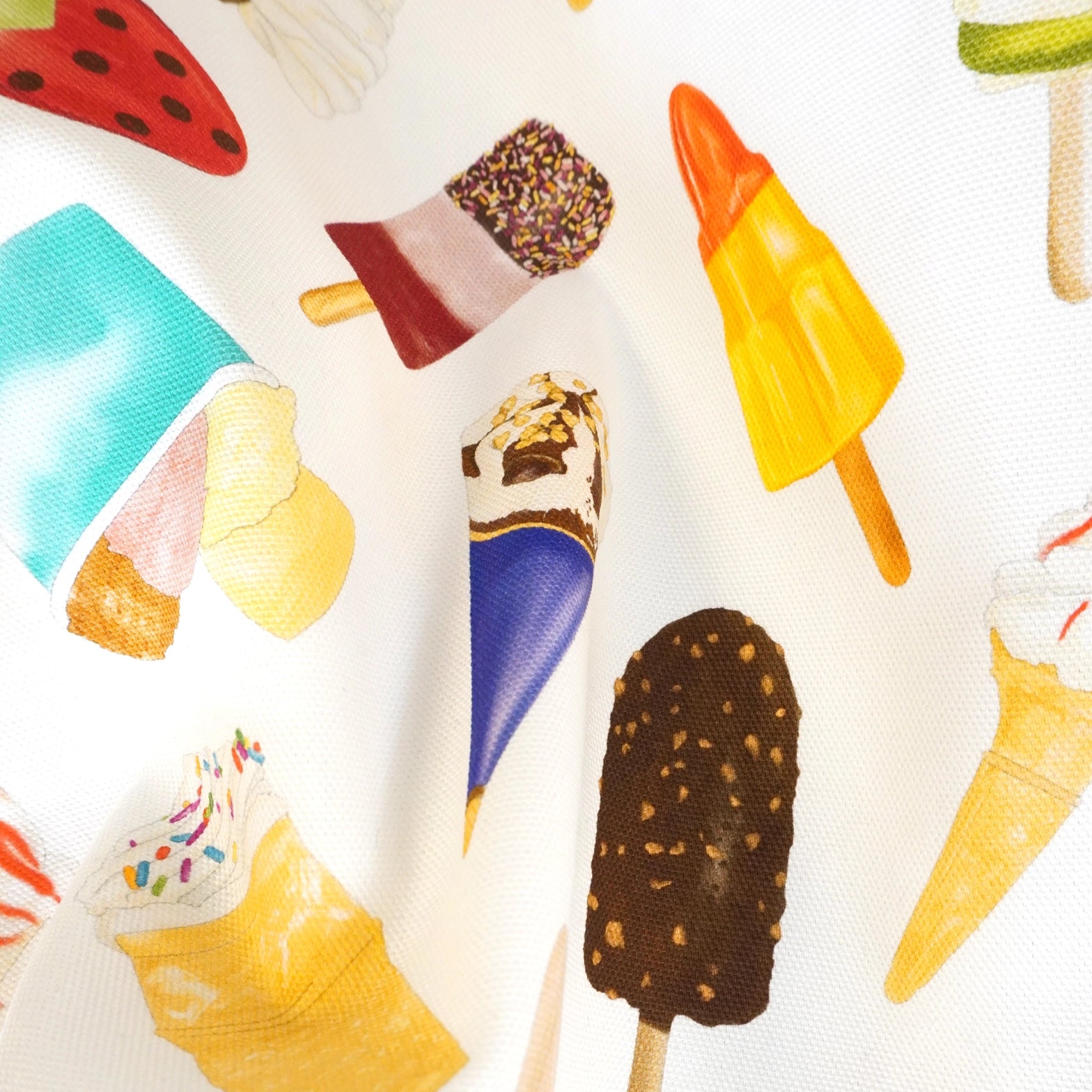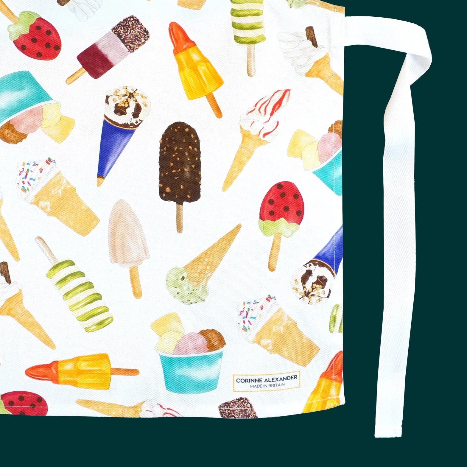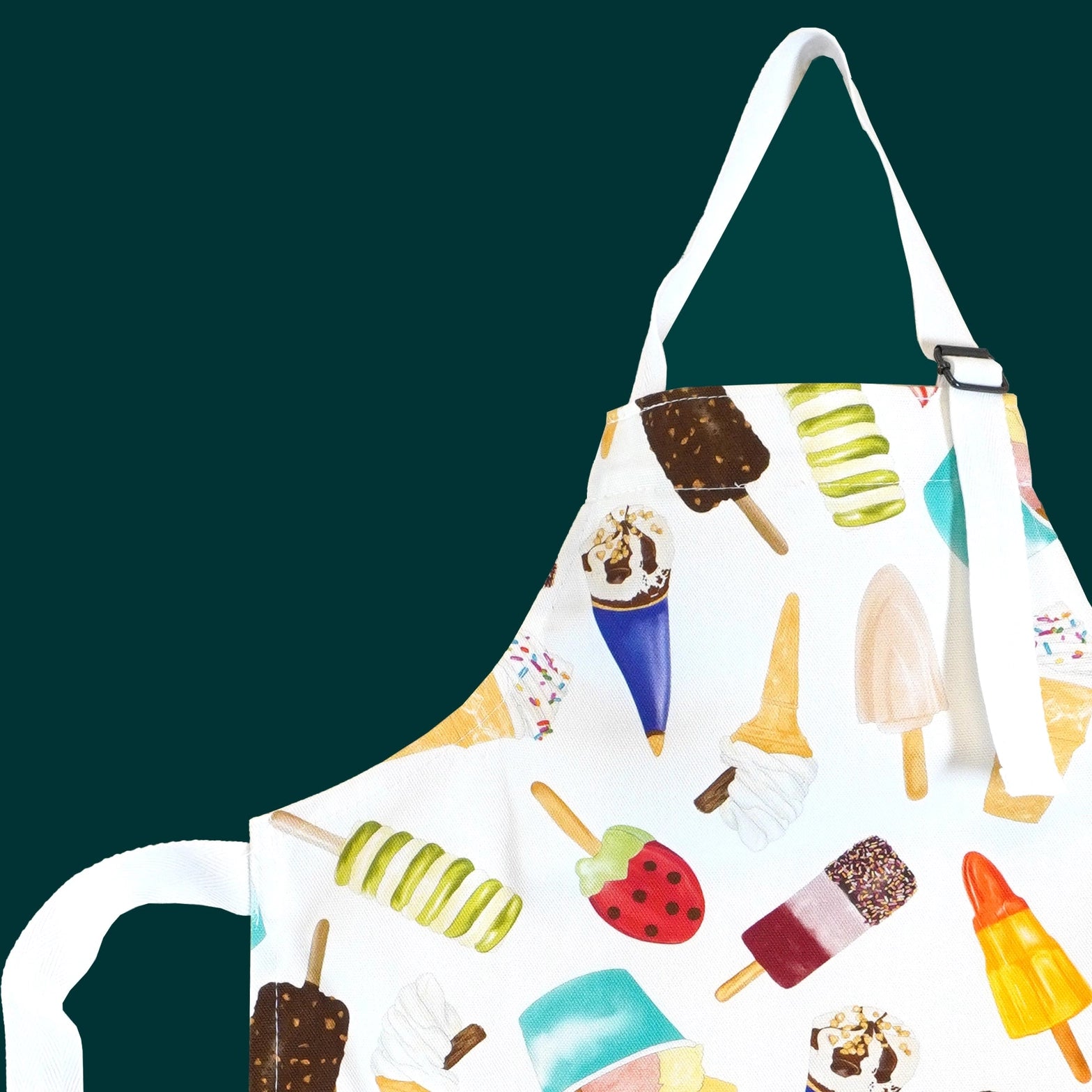 The perfect apron to encourage your little one to help out in the kitchen, featuring a delightful ice cream print adorned with whimsical illustrations of ice cream cones and ice lollies.