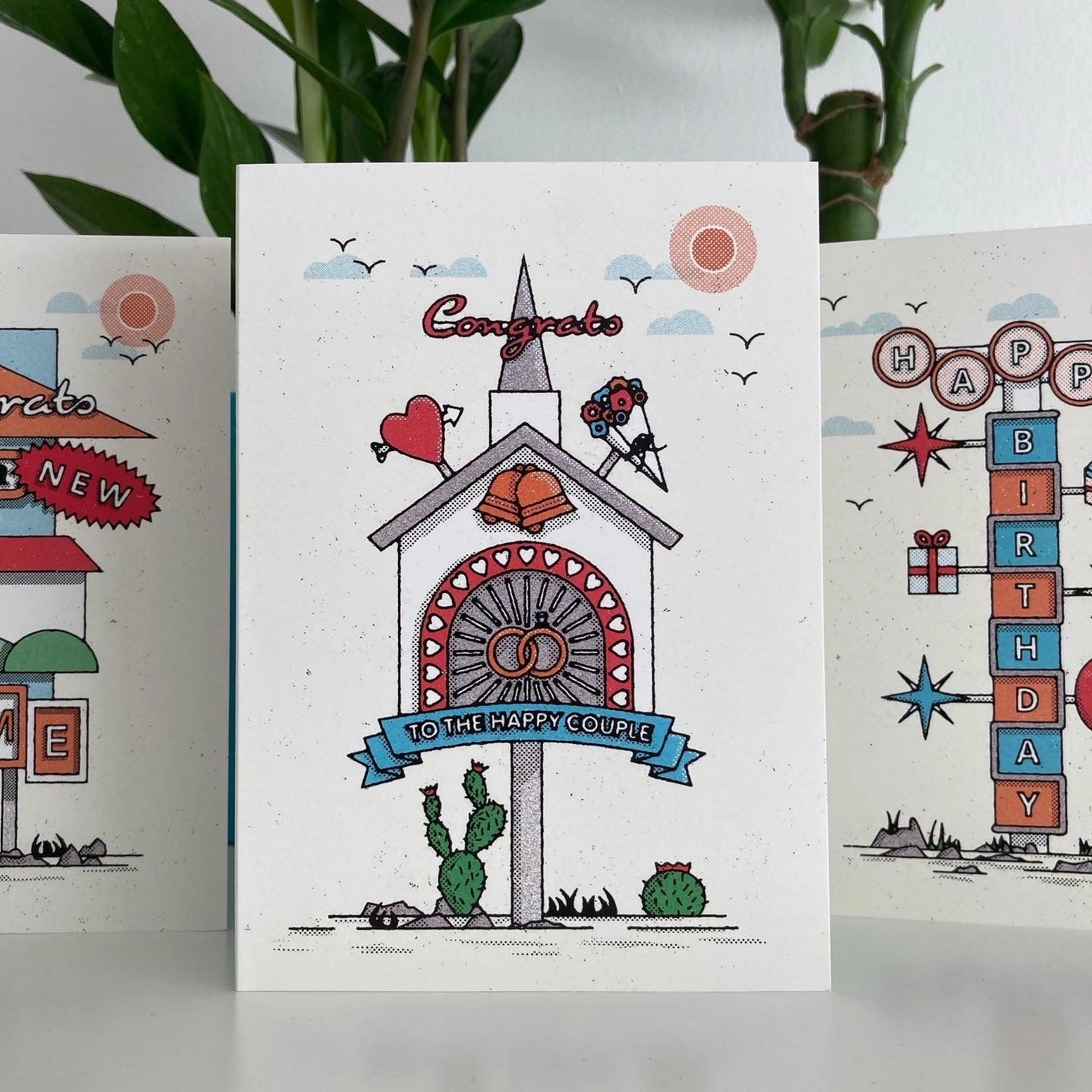 This card is inspired by "shotgun wedding" Las Vegas wedding chapels. Perfect for occasions such as engagements, weddings or civil partnerships.