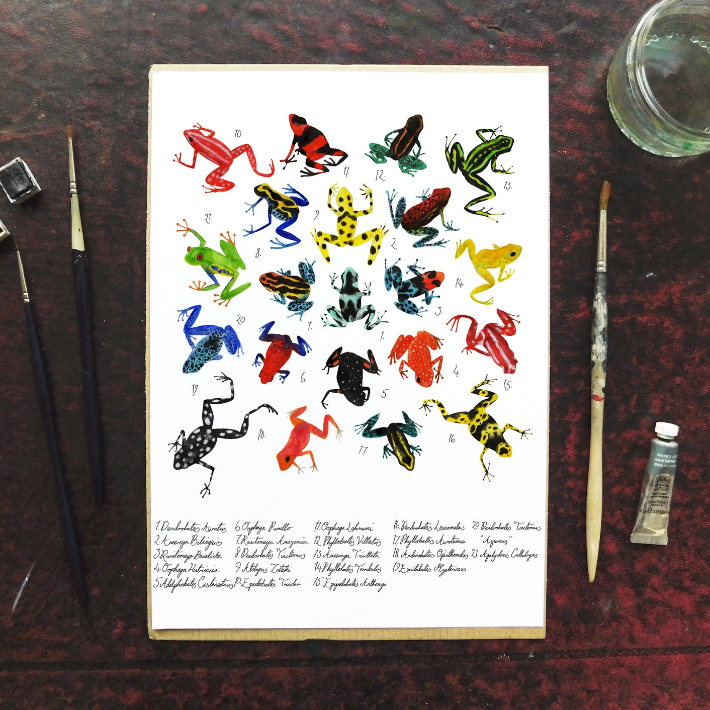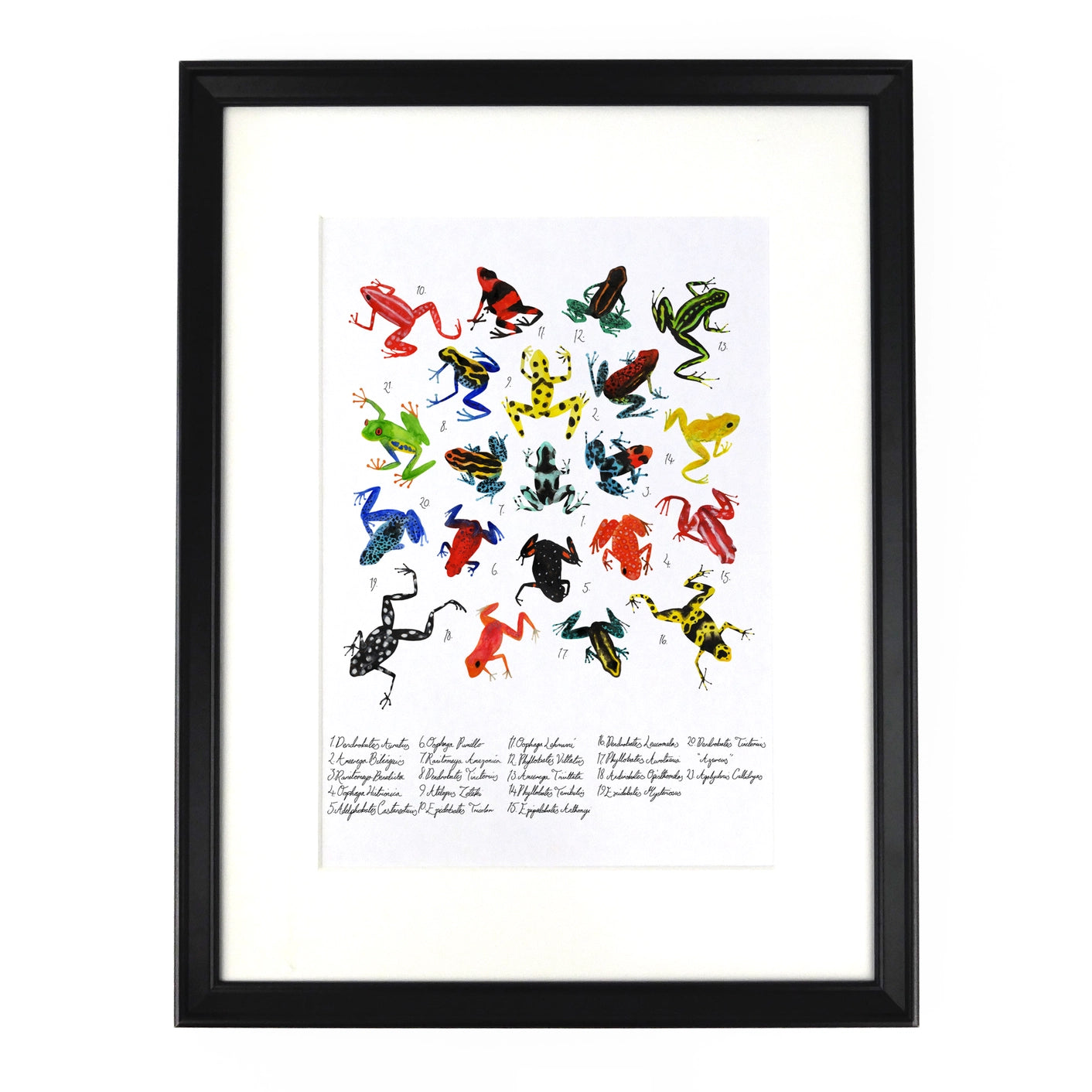For a vintage book plate feel, the species of each frog has been noted underneath in calligraphy. The perfect addition to an art collection or gallery wall, or great for adding a striking focus to a room on its own.