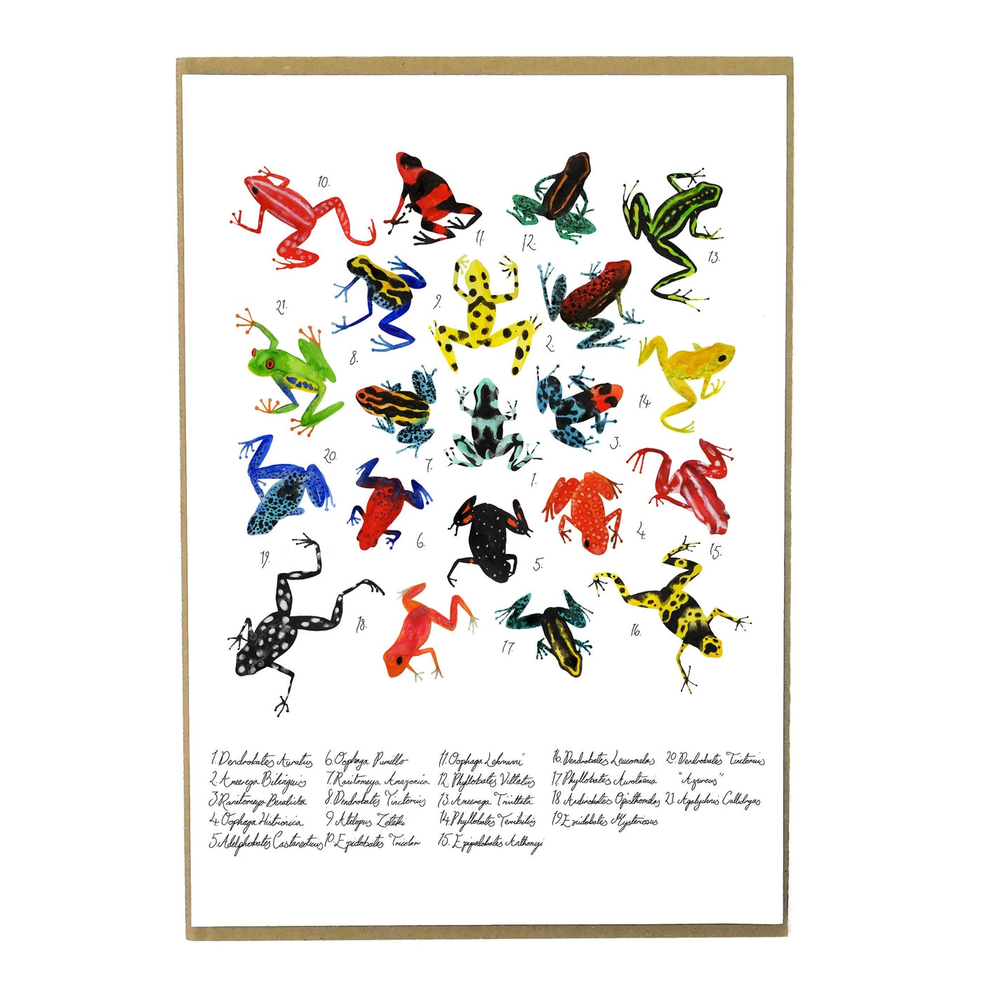 This fun print features 21 different species of jewel-bright poison dart frogs, and a red-eyed tree frog may have snuck in there too.