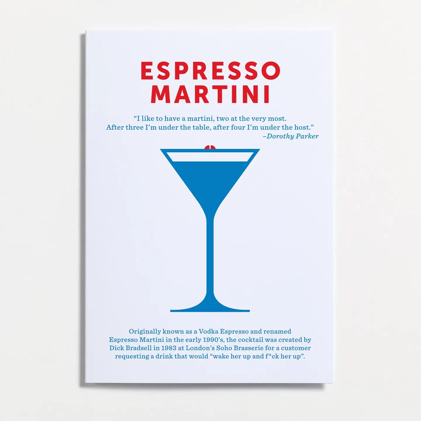 Espresso martini cocktail greeting card, complete with classic cocktail recipe on the reverse.