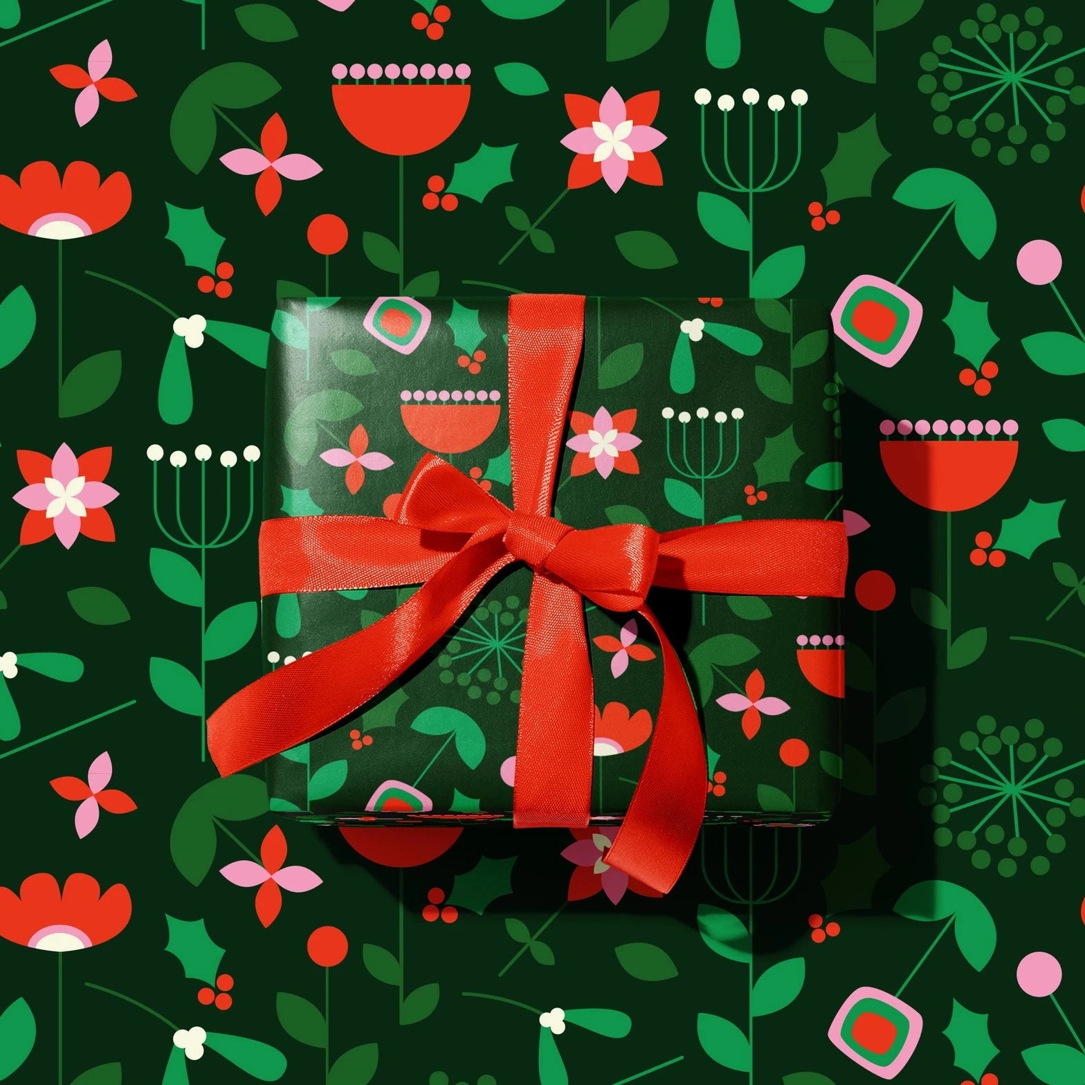 - Bountiful Festive Bloom mid-century floral style illustrated wrapping sheet.Wrap: 500mm x 700mm, printed on 120gsm uncoated paper.