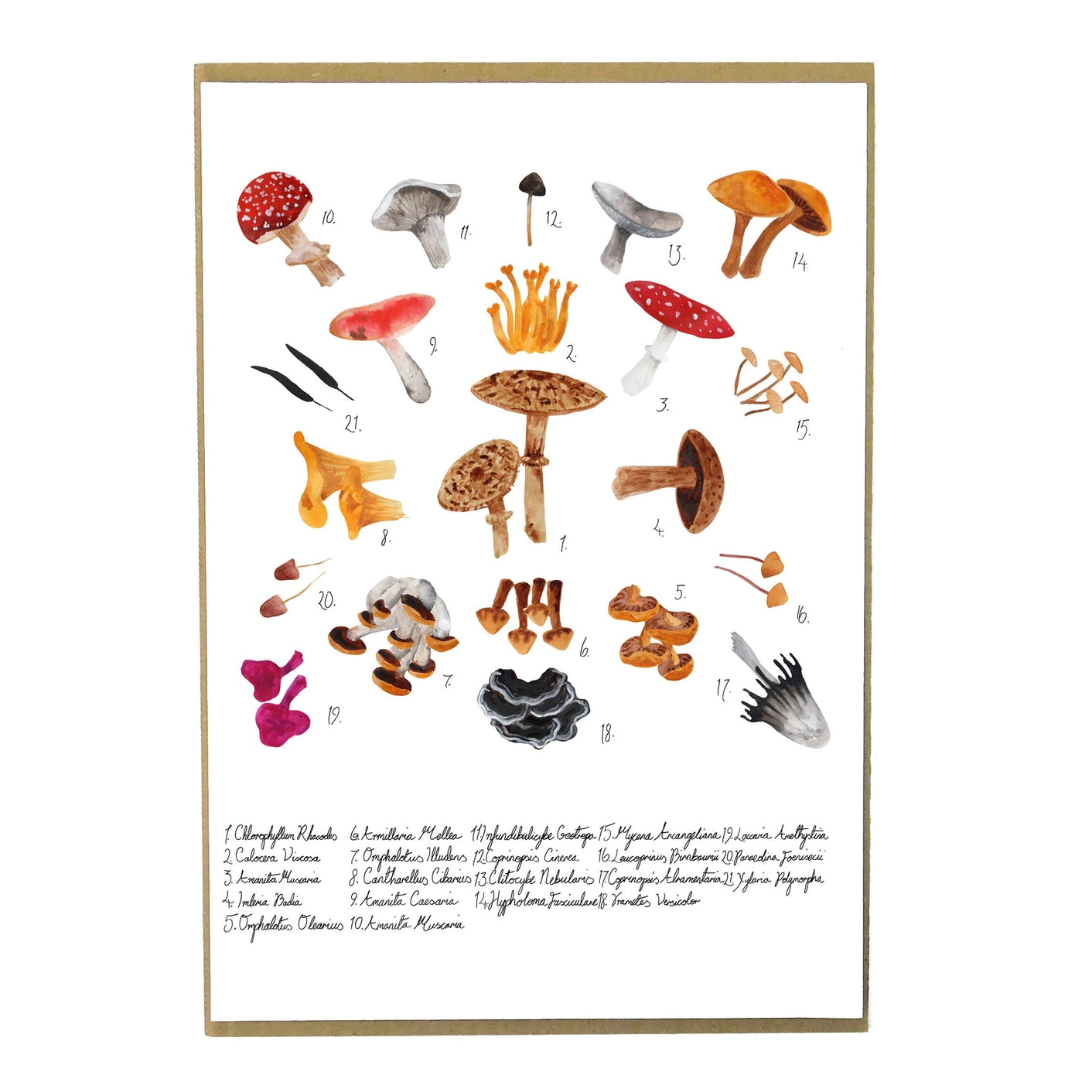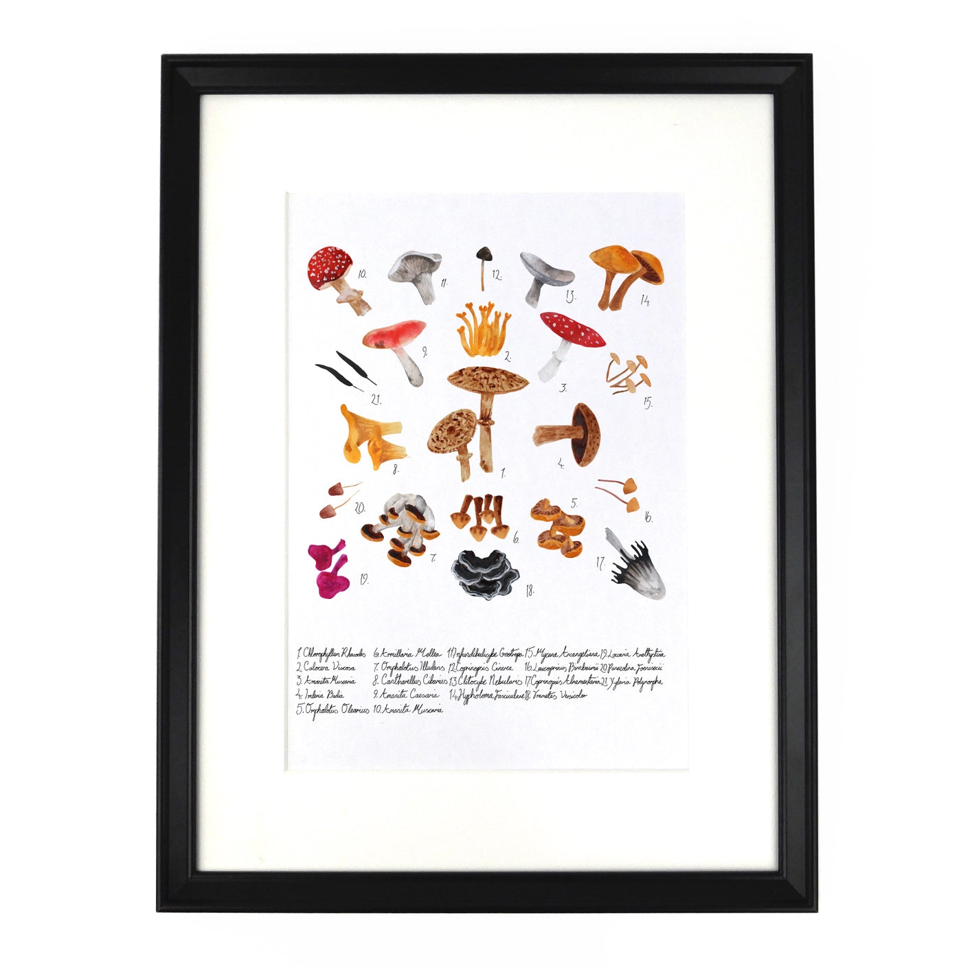 For a vintage book plate feel, the species of each mushroom has been noted underneath in calligraphy. The perfect addition to an art collection or gallery wall, or great for adding a striking focus to a room on its own.