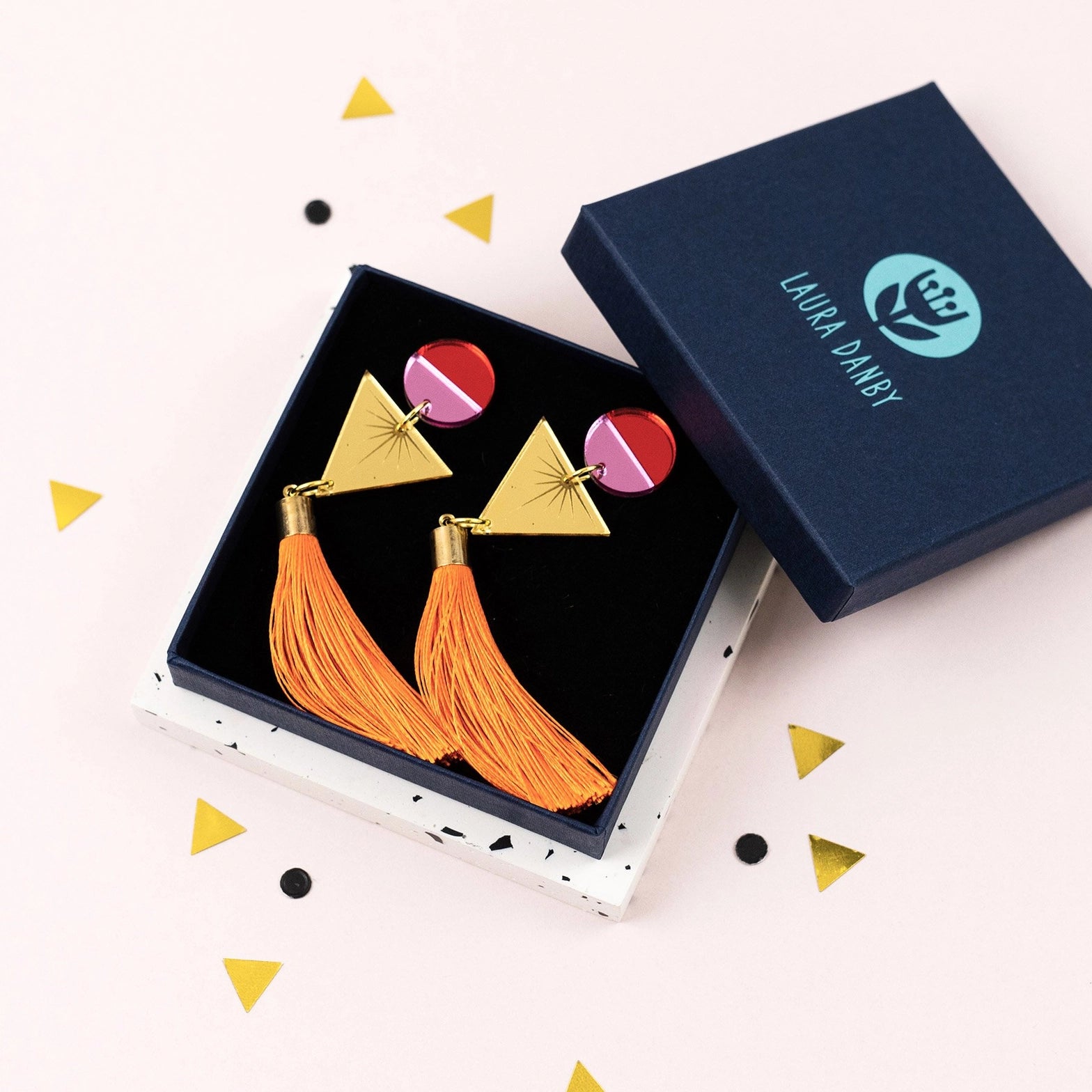 Handmade from 70% recycled, mirrored acrylic in pink and red semi-circles, with a gold triangle below, engraved with a sunburst. Below this sits a vibrant rich silk tassel in bright orange.Perfect for the party season or to pep up a date, they make a thoughtful gift for Christmas, birthday, anniversary, valentines or Mothers Day present