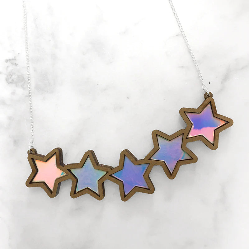 A striking wooden necklace with a row of 5 iridescent stars. The middle of the stars is a stunning luminous colour that seems to change when seen from different angles, from pink to purple, green, orange and blue.