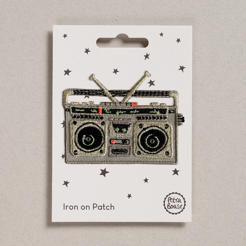 A richly embroidered Retro Boom Box patch with an iron-on backing. The patch is Grey with pops of neon and silver embroidered detailing.