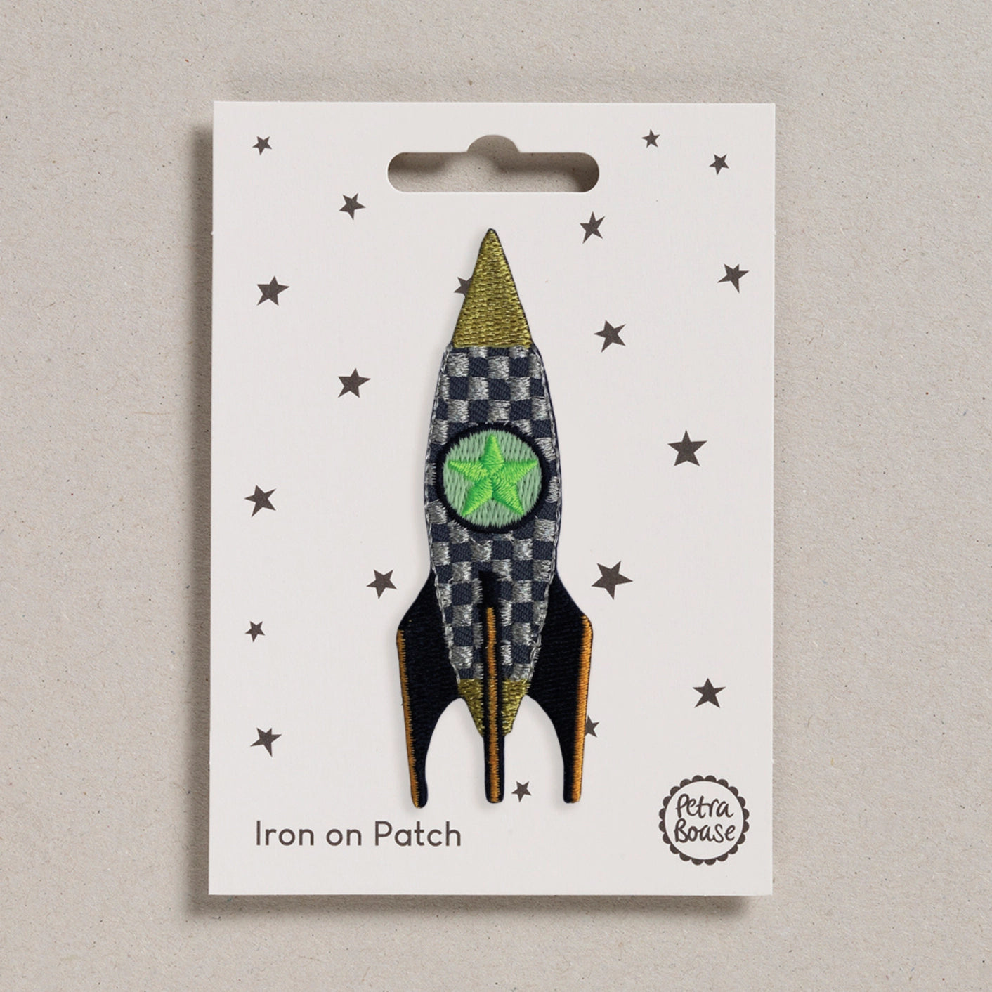 A richly embroidered rocket fabric patch. There is an accent of glow in the dark thread around the star.