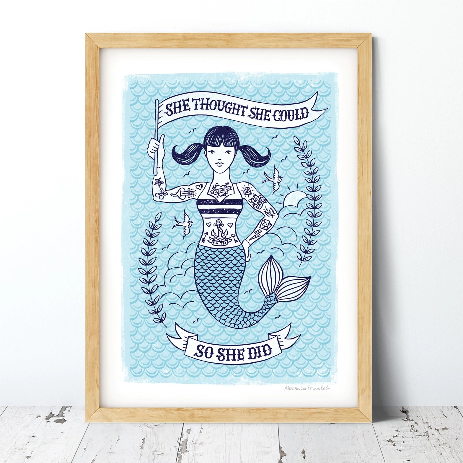 A hand lettered and illustrated tattoo mermaid print, the perfect congratulations gift for the girl who thought she could.