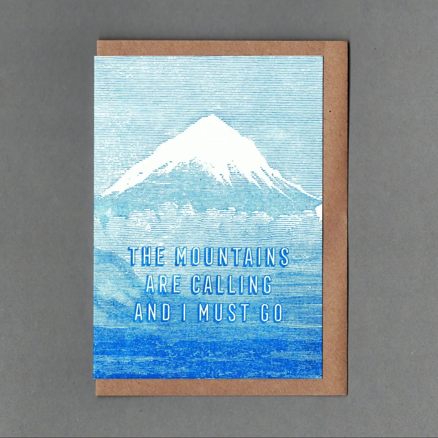 The Mountains Are Calling and I Must Go in blue ink. Part of the Hearth & Home exclusive collection for those celebrating a move, embarking on a new path, or need some encouraging words in times of difficulty.
