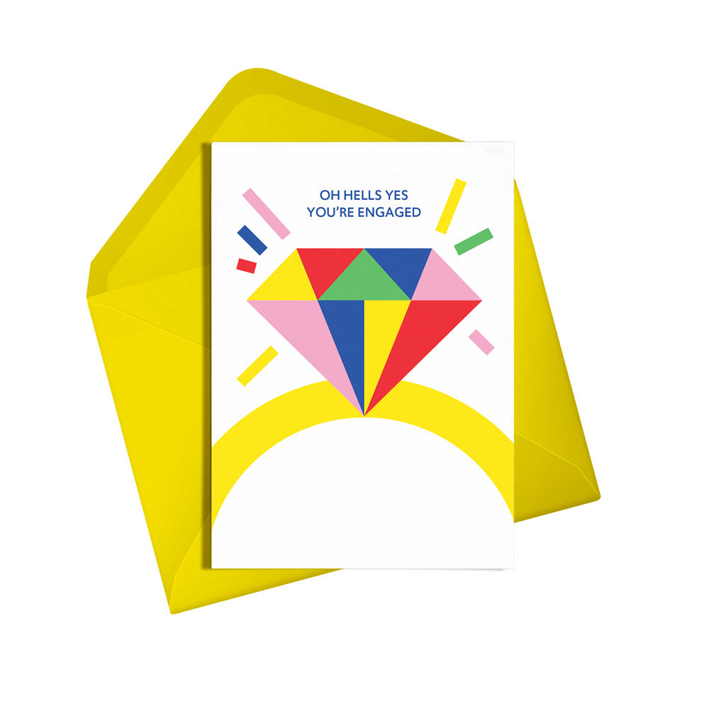 Oh hells yes, you’re engaged! Celebrate the happy news with this blingy diamond of a card. Featuring a rainbow engagement ring.