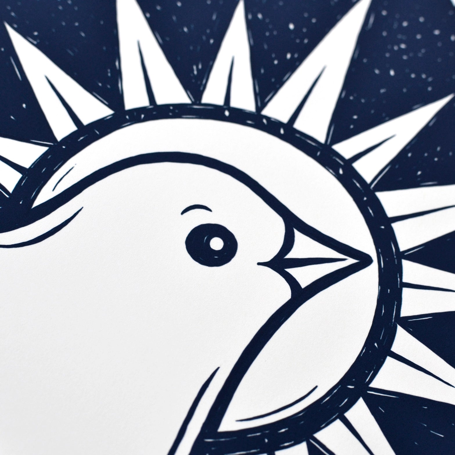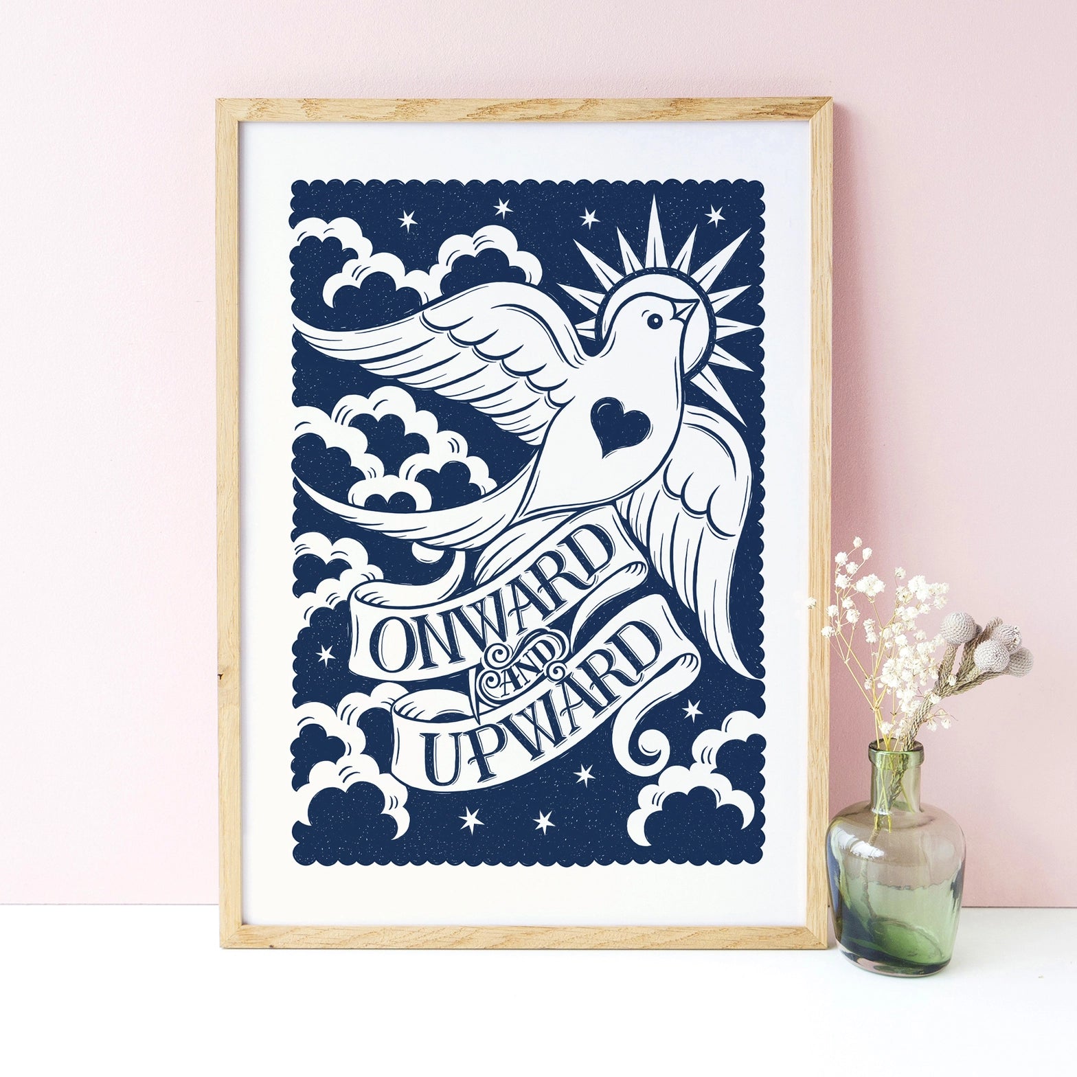 An encouraging and uplifting print, hand drawn and lettered in blue and white. Featuring a white dove in a blue sky with hand lettered banners.