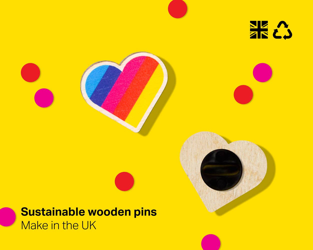 Birch Plywood is a natural material the colour, grain, and texture of the wood can vary from sheet to sheet. You might also notice a charred effect and ‘smoky’ smell from the laser cutting process. Wooden pin badges use between 20 and 24 times less energy than enamel badges to produce!