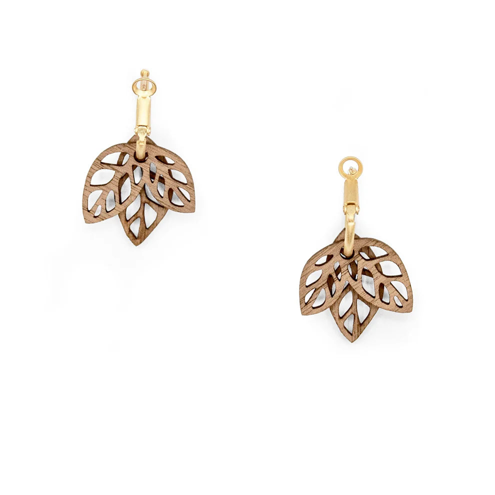 Golden hoop earrings with two wood green leaves hand painted. Antiallergic findings. Designed by Marta Chojnacka & Joan Ayguadé Jarque.