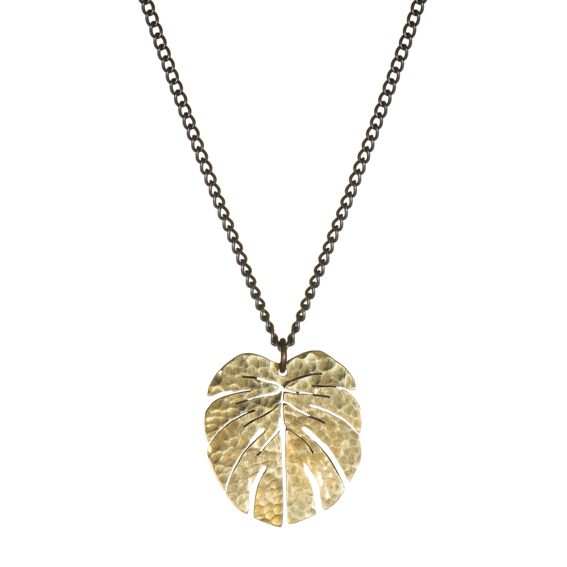 'Song of the Tree' tropical leaf pendant with antique gold effect chain.