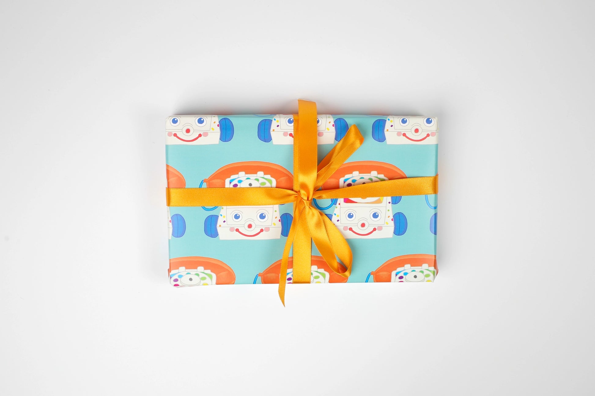 This wrapping paper design takes you down memory lane! Featuring a hand-drawn illustration of the beloved fisher price vintage toy telephone on a turquoise background, this gift wrap is the perfect accompaniment to a birthday present for someone who’s stuck in the 80’s.