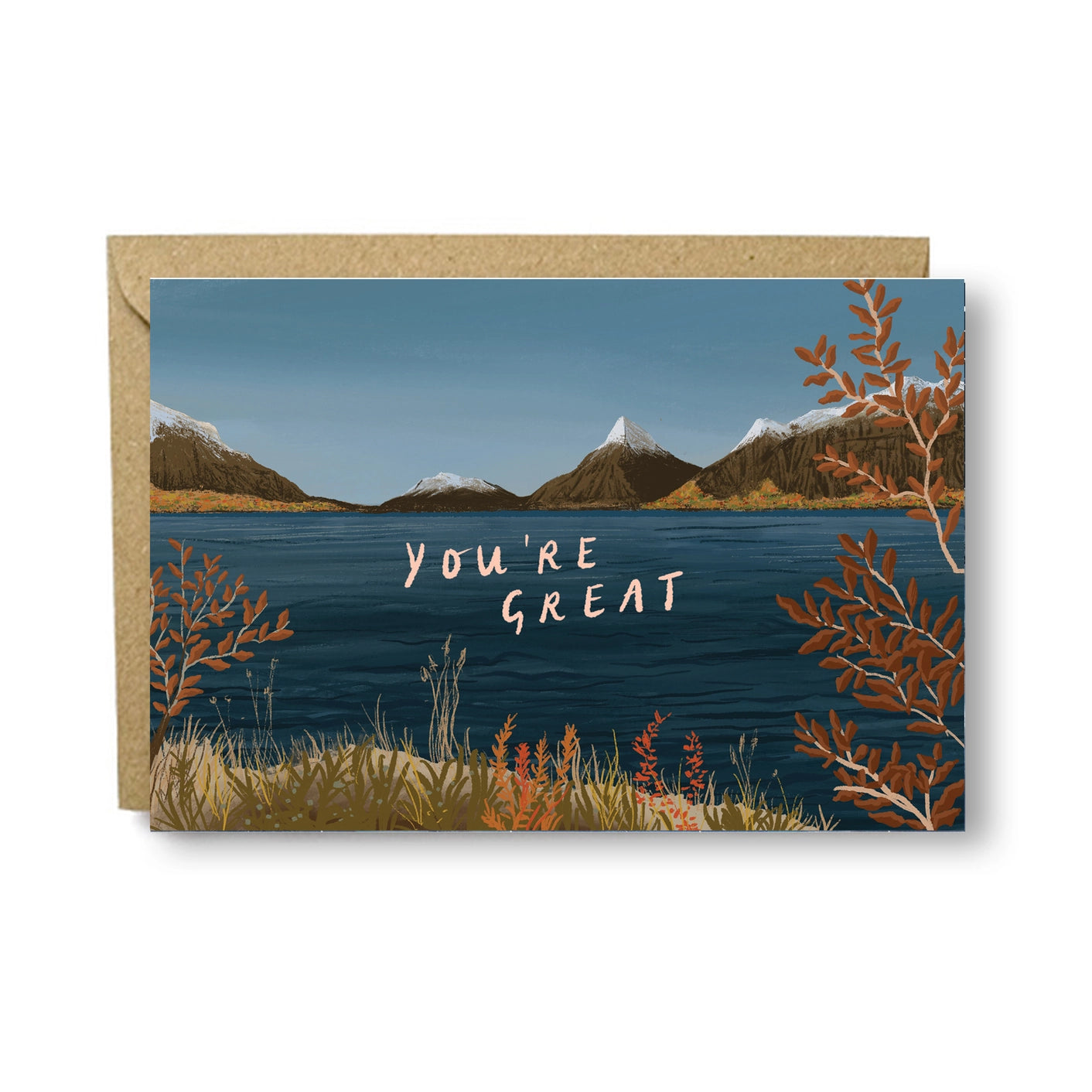 Beautiful greetings card printed from an original illustration, on luxury Italian tintoretto gesso card with the text, "You're Great". Ideal for valentines, birthdays, occasions, friend cards etc